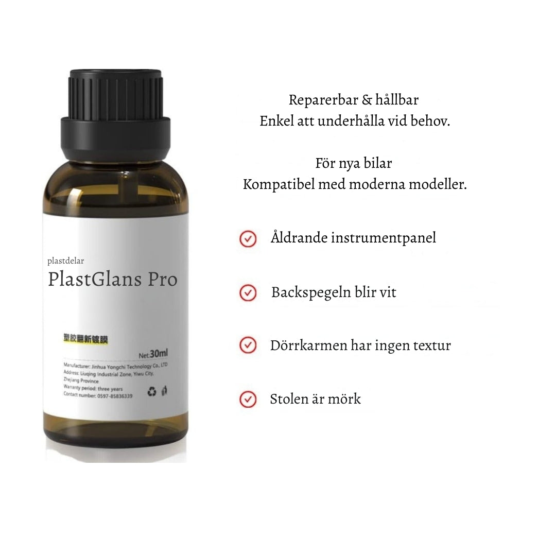 Trött på blekta, gråa plastdetaljer? Med PlastGlans Pro återfår din bils interiör- och exteriörtrim sin rika, mörka glans – och håller sig snyggt länge. En snabb och enkel lösning som får din bil att se ut som ny igen.